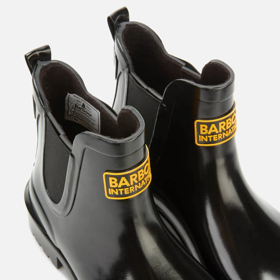 Barbour International glossy black wellingtons with a Chelsea boot-inspired design. The ‘Assen’ slip-on ankle boots are designed with elasticated side gores, a signature Barbour International badge at the front and a durable rubber outsole with a small heel. A heel pull loop with a logo stud and a branded heel counter completes the design.