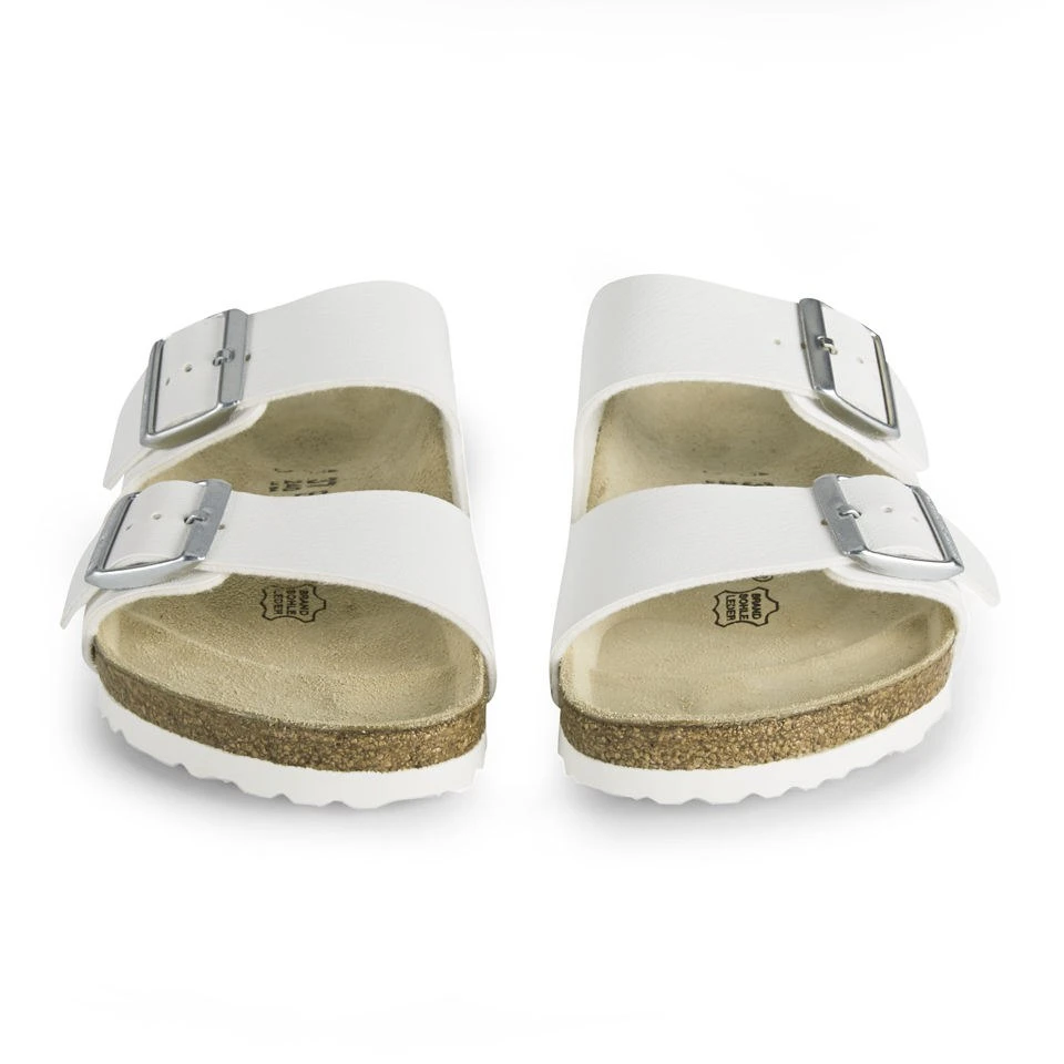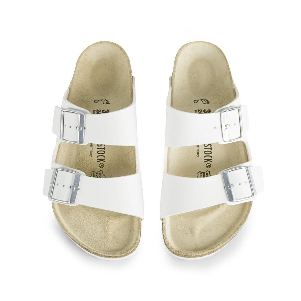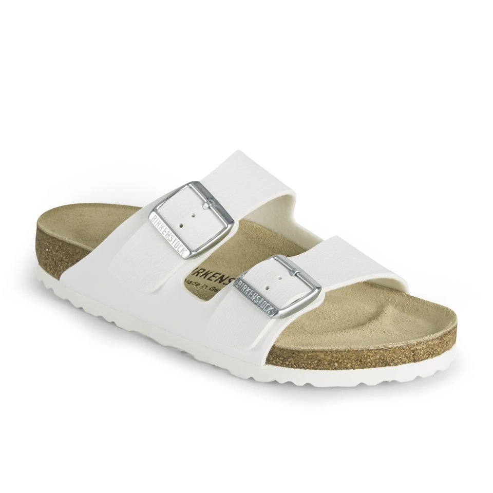 These women’s Birkenstock ‘Arizona’ Slim Fit Sandals have an adjustable two-pin buckle, which can be used to tailor fit the shoe to the foot. The classic Birkenstock is usually bought on the large side, in order to allow for the natural rolling motion of the feet, so this is an important detail. These Birkenstock sandals are thinner in width than the classic design, but they feature a lot of the same signature details. With a synthetic upper and additional foot bed support for super comfortable wear, these shoes are perfect for walking. The state of the art Birko Flor upper gives the sandals an orthopaedic design.