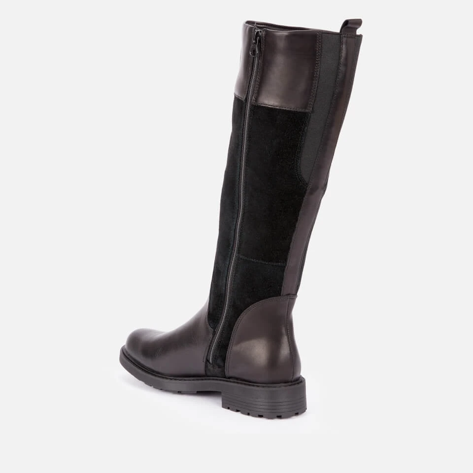 Clarks black leather ‘Orinoco 2’ boots with a knee-high length. Lined inside for warmth. Cleated sole adds extra grip.