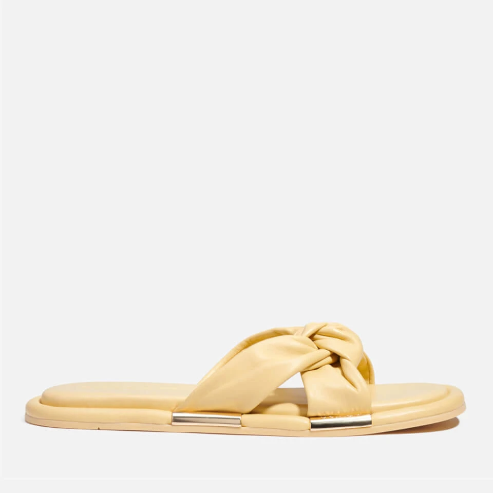 - Knotted vamp, gold-tone logo plaques, cushioned footbed, rubber soles