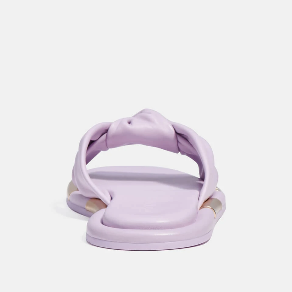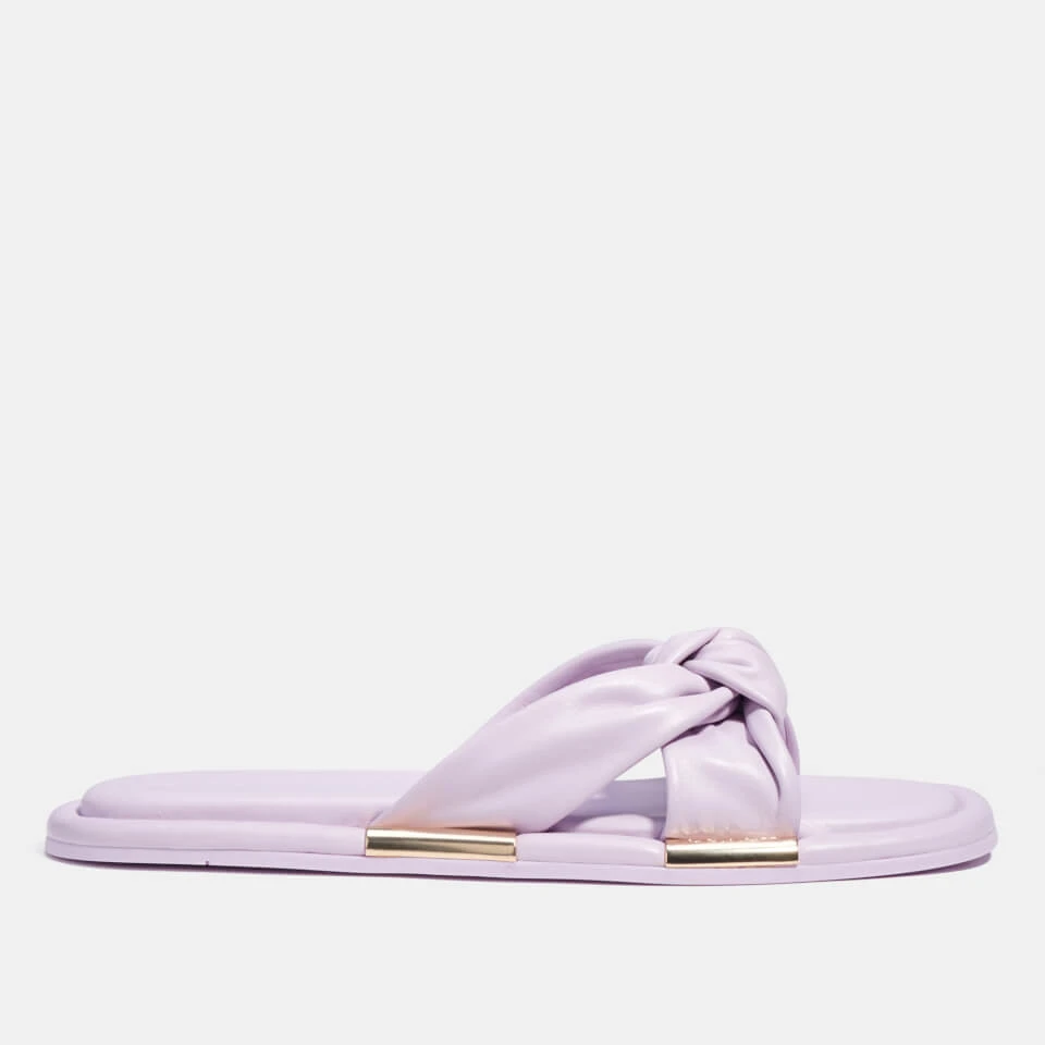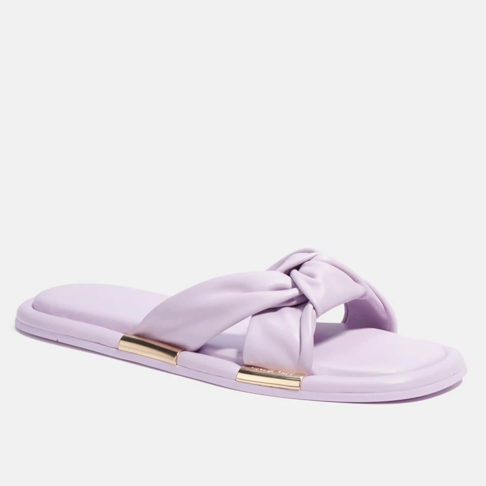 - Knotted vamp, gold-tone logo plaques, cushioned footbed, rubber soles