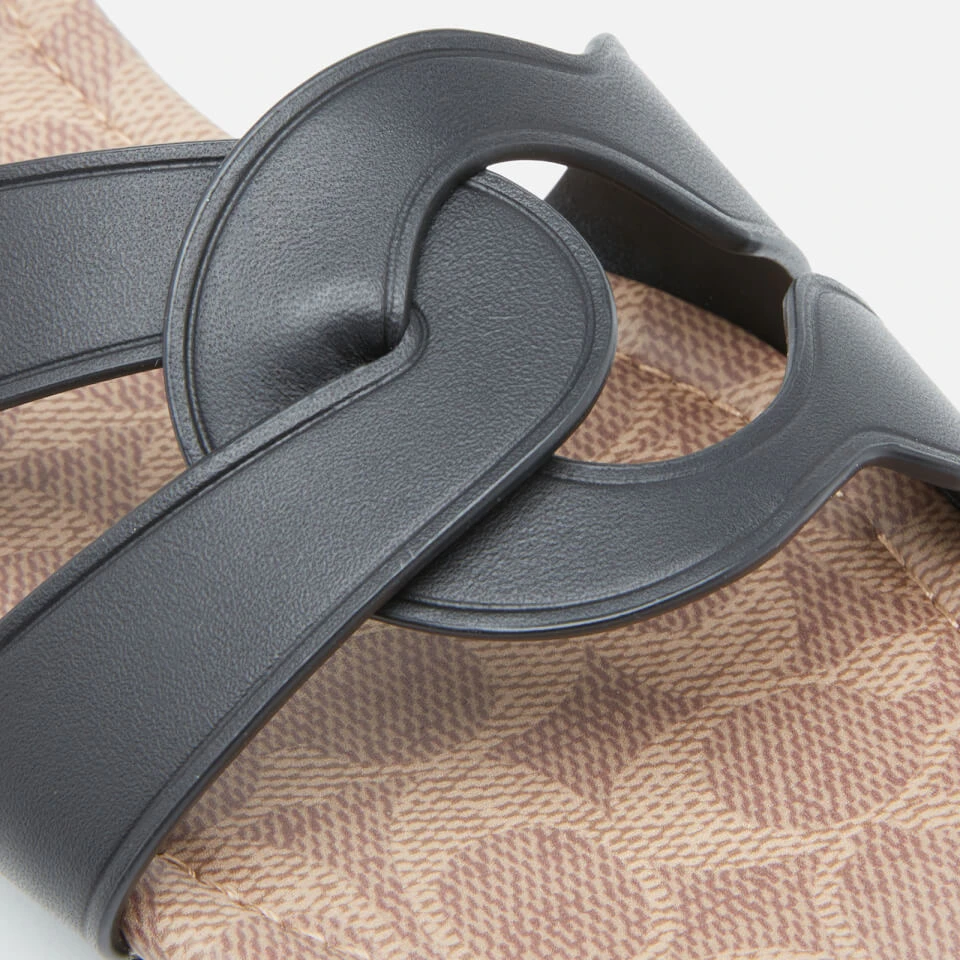 Coach black leather sandals with interlocking straps that put a new twist on the brand’s signature ‘C’ logo. The slip-on sandals are designed with a signature coated canvas footbed with an all-over ‘C’ logo. Finished with a slim tonal rubber outsole.