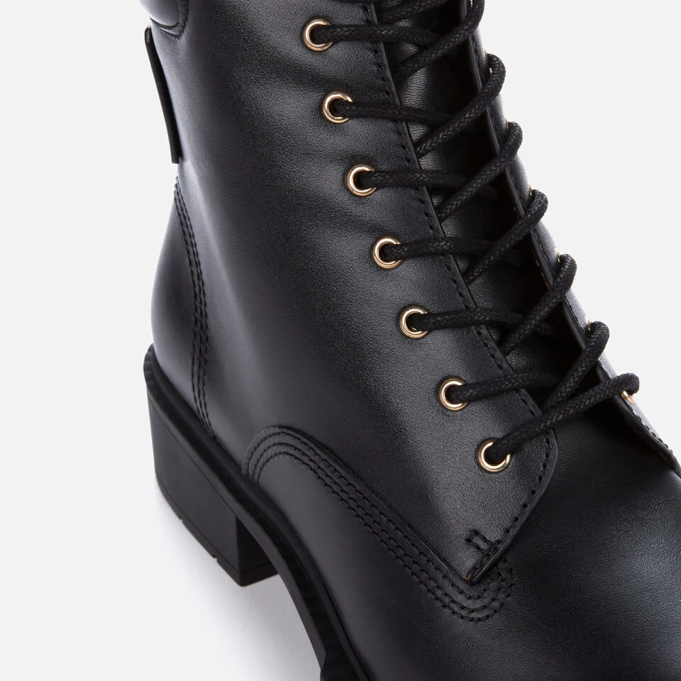 Rich black leather Coach boots with a classic military-inspired silhouette. The tough ‘Lorimer’ boots have a round toe design, gold-tone metal eyelets and signature ‘C’ letter hardware at the top. The lace-up boots sit on a chunky rubber lug sole for increased traction and long-lasting comfort. A chunky block heel, a padded ankle collar for increased comfort and a debossed logo patch on the heel completes the luxe leather boots.