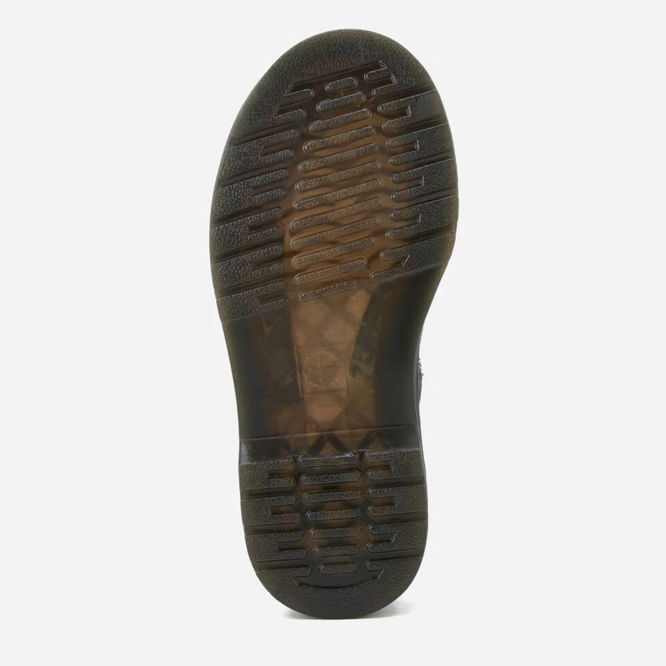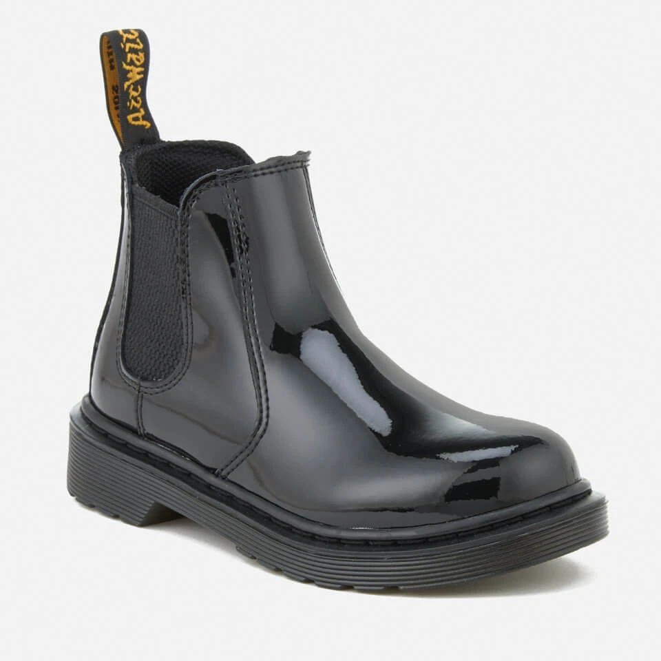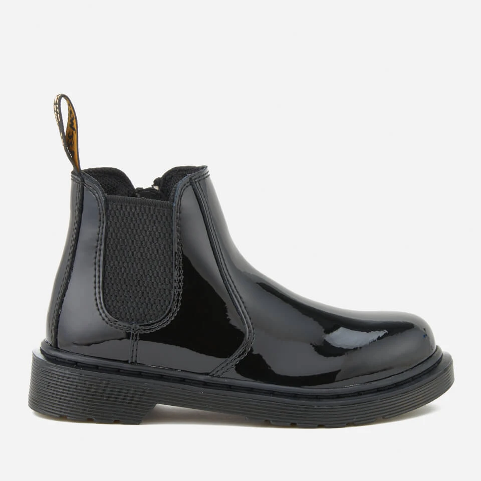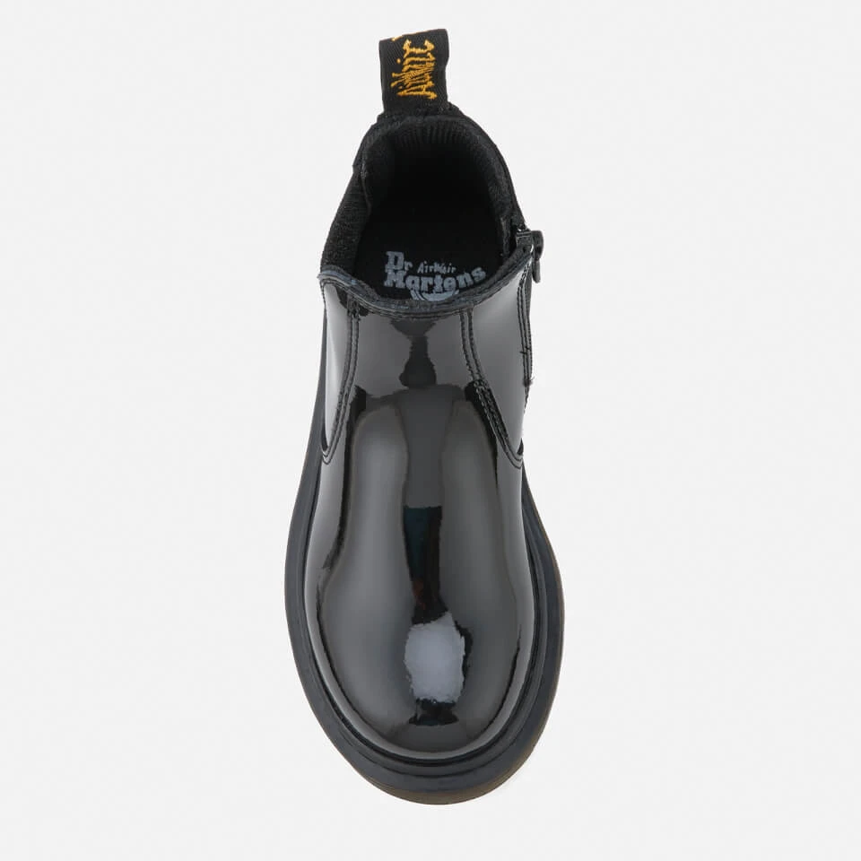 Kids’ ‘Banzai’ black leather Chelsea boots from Dr. Martens. Crafted from glossy, patent Lamper leather, the classic slip-on ankle boots feature tonal elasticated outer gussets and a zip closure to the inside. Set on a durable air cushioned sole which is cemented to the upper; the boots feature the signature sole pattern for added grip. Complete with contrast yellow stitching, side grooves on the midsole and an ‘Air Wair’ woven brand tab to the heel.