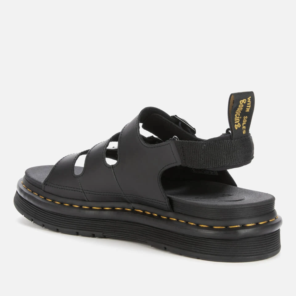 The sandals sit on Dr. Marten’s signature AirWair sole in black with grooved sides and the brand’s iconic yellow welt stitching. A slightly wider fit and a moulded footbed provides long lasting comfort. Logo-engraved detail on the tonal buckles, an AirWair heel pull loop and a debossed logo on the footbed complete the matte black sandals.