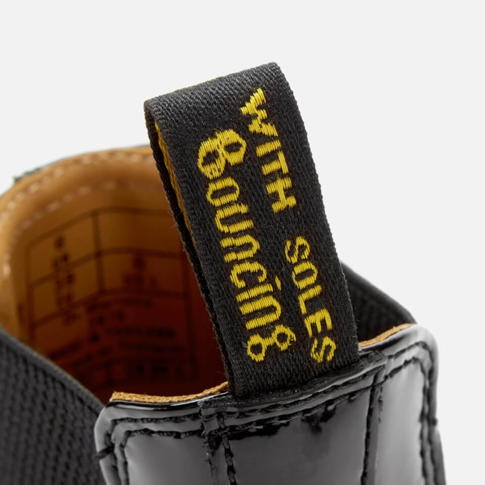 The pull-on tab on these Dr. Martens Chelsea boots features the words ‘with bouncing soles’. These boots draw on the iconic Chelsea boot style dating back to the Victorian era. The patent lamper Chelsea design sweeps into the 21st century with comfortable air-cushioned, rubber soles.