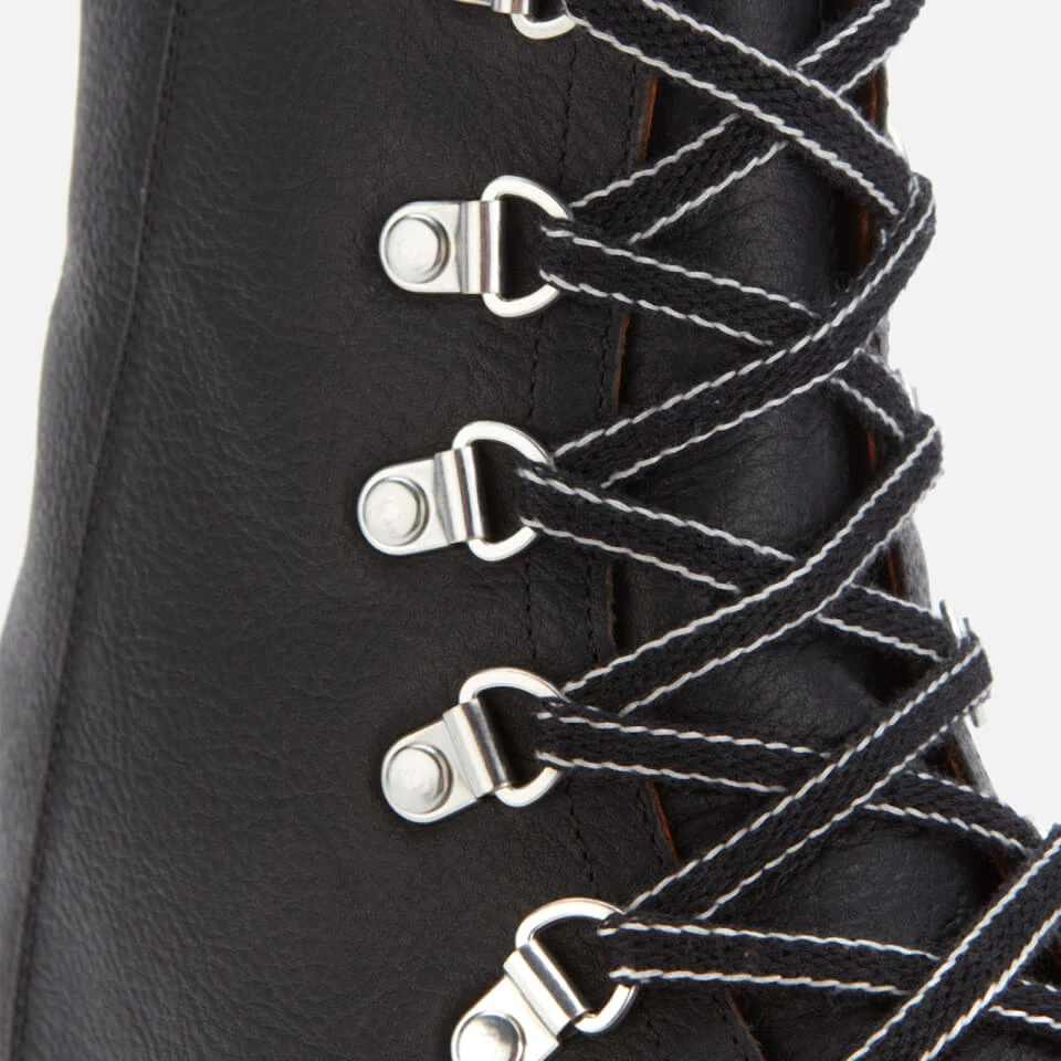 Grenson’s ‘Brady’ boots are inspired by hiking style. Handmade, the shoes are crafted from grained leather and set upon Goodyear welted soles. The boots are secured with a speed lacing system, detailed with brass eyelets. Designed with a gripped Extralight® commando sole, the shoe is simultaneously sturdy, lightweight and durable. Finished with a round toe and canvas heel pull. Go up to the nearest whole size if you take a half sizes.