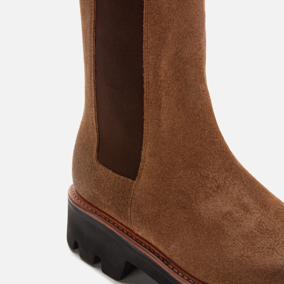 Grenson’s Doris boot is modelled on the traditional Chelsea boot silhouette, reimagined with a calf-height construction. They’re crafted from burnished snuff suede, lending to a vintage aesthetic. They are finished with elasticated side panels, dual pull tabs and the label’s signature chunky Cass sole.