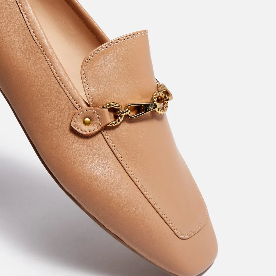 - Square toes, gold-tone hardware, faux leather linings, rubber soles