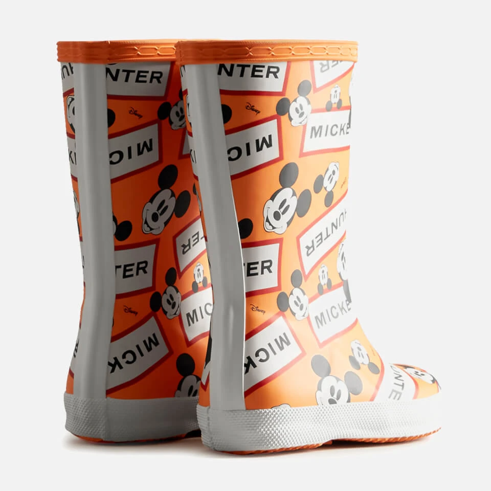 These Hunter X Disney orange first wellington boots for little ones combines renowned expertise in wet weather attire with playful Mickey Mouse motifs. Made from waterproof, natural rubber, they feature a flatter sole and rounder toe in addition to enhanced traction on the sole. Soft cotton lining ensures comfortable wear.