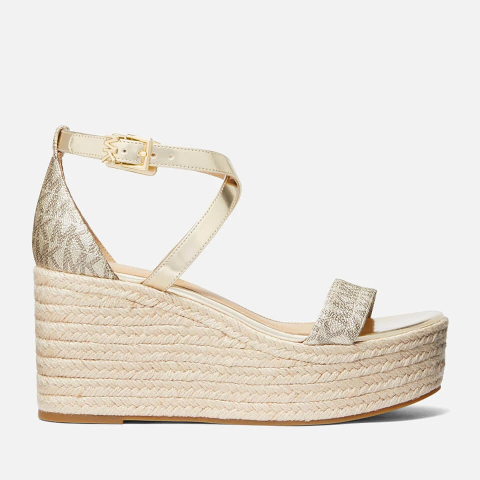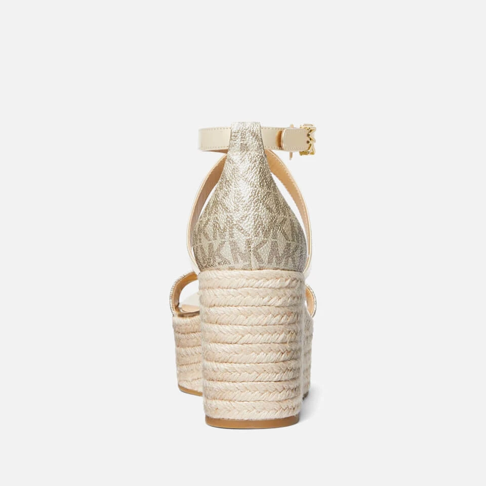 - Metallic branded design, gold-toned hardware, open toe, jute wedge