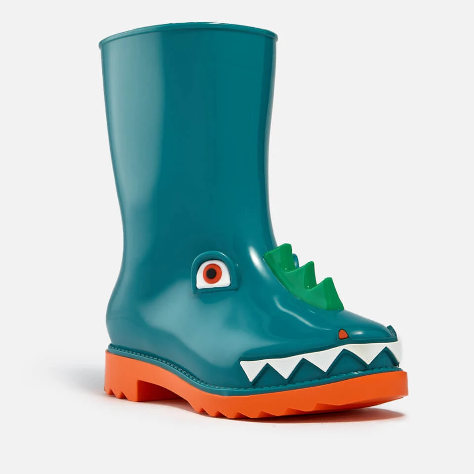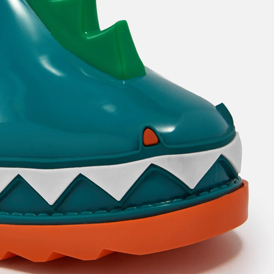 - Green dino spikes, appliquéd eyes and teeth, soft foam footbeds, orange rubber soles, scented
