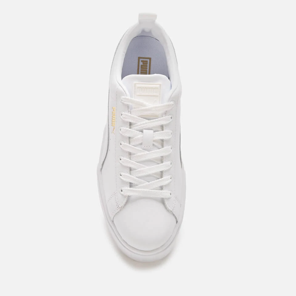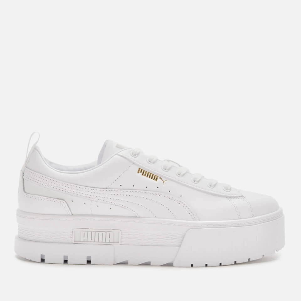 Puma’s Mayze flatform trainers are a streetwear style that blends smooth white leather uppers and a chunky stacked rubber sole for a statement look. The lace-up style has signature details like the Puma Formstrip on the sides and metallic logo detail for a classic look. Webbing pull tabs for easy on and off.