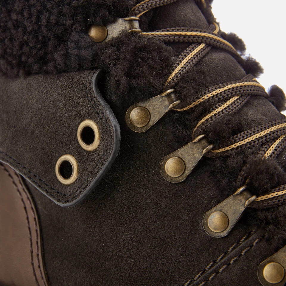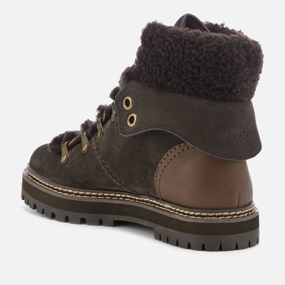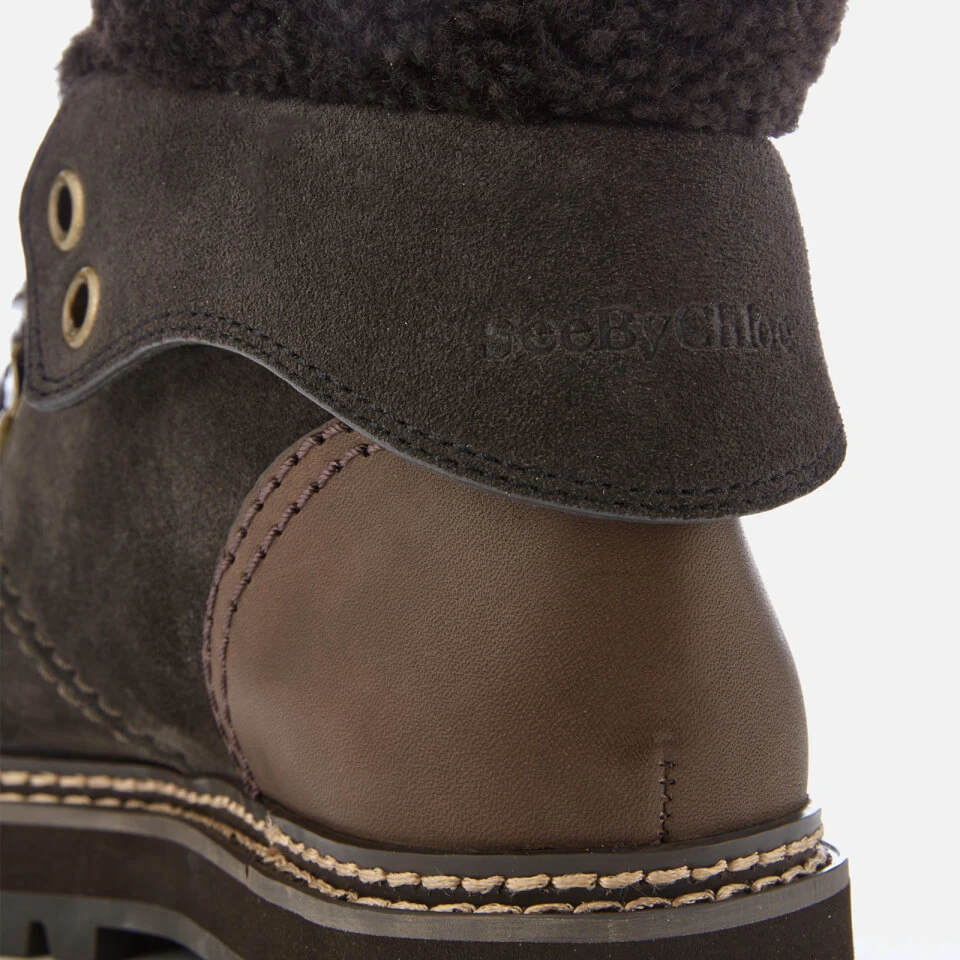 Suede hiking style boots from See By Chloé. Crafted from supple suede, the women’s round toe ankle boots are designed with a shearling cuff and lace trim, a fold down ankle flap with debossed See By Chloé branding and antiqued gold-tone metal eyelets. The lace fastened boots sit on a stacked sole with contrasting welt stitching and a chunky lug outsole for added grip. Complete with a branded dust bag.