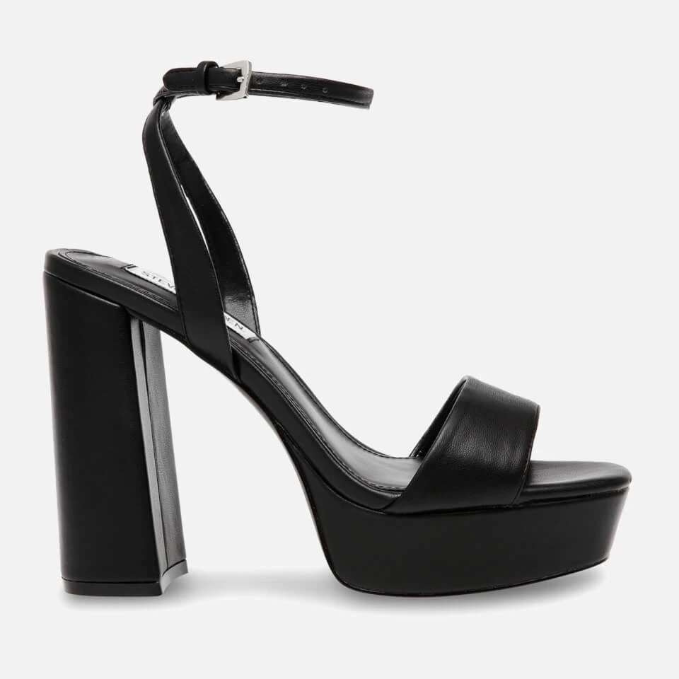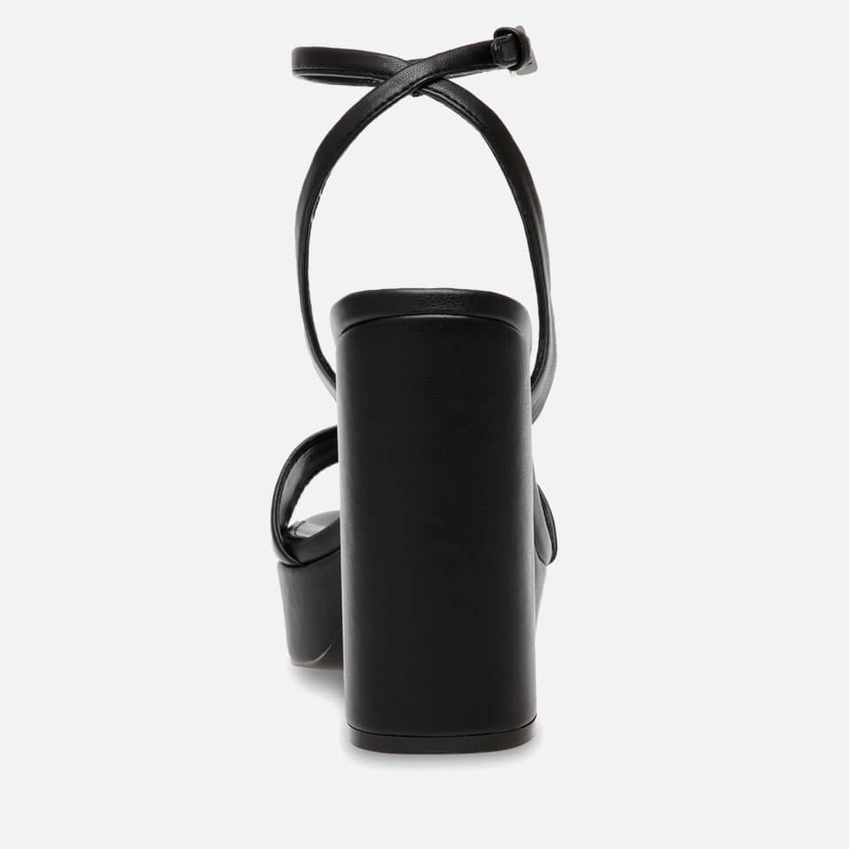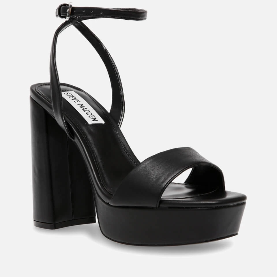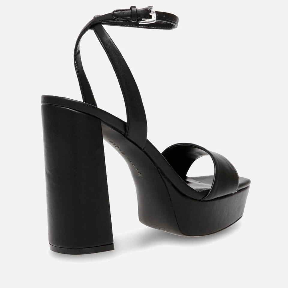- Adjustable ankle strap, block heel, open toe, logo patch