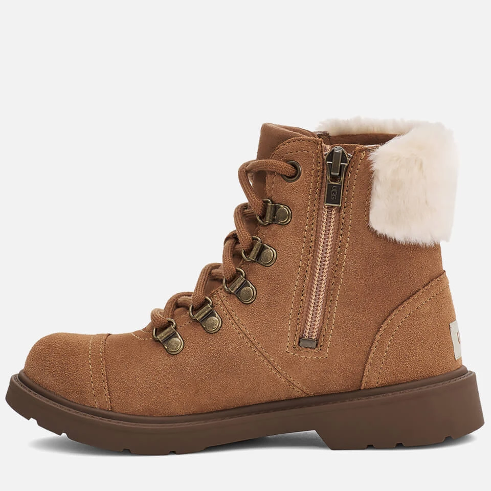 Keep kids’ feet warm and dry in wet weather with the UGG Azell boots. Made with seam-sealed, waterproof suede uppers, they have antimicrobial linings to keep feet feeling fresh, cushioned insoles and side zips to easily slip them on and off. Hiking-style D-ring eyelets and a faux fur collar complete the winter-ready design.