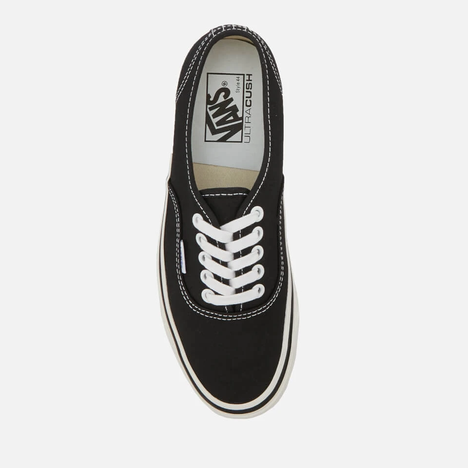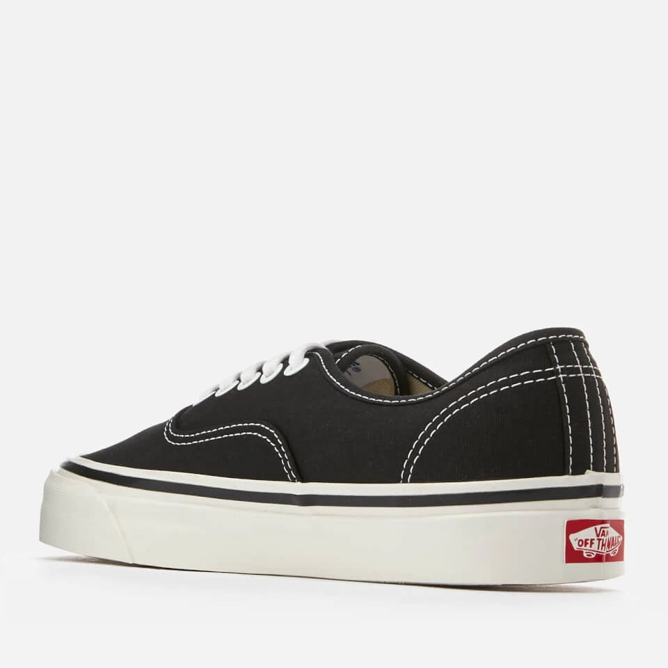 Men’s black canvas trainers from the Vans Anaheim Factory pack. Paying tribute to the first Vans factory in Anaheim, the ‘Authentic 44’ sneakers are inspired by the original ‘Authentic’ with slightly higher foxing tape, glossed sidewalls and the original drill lining weight.