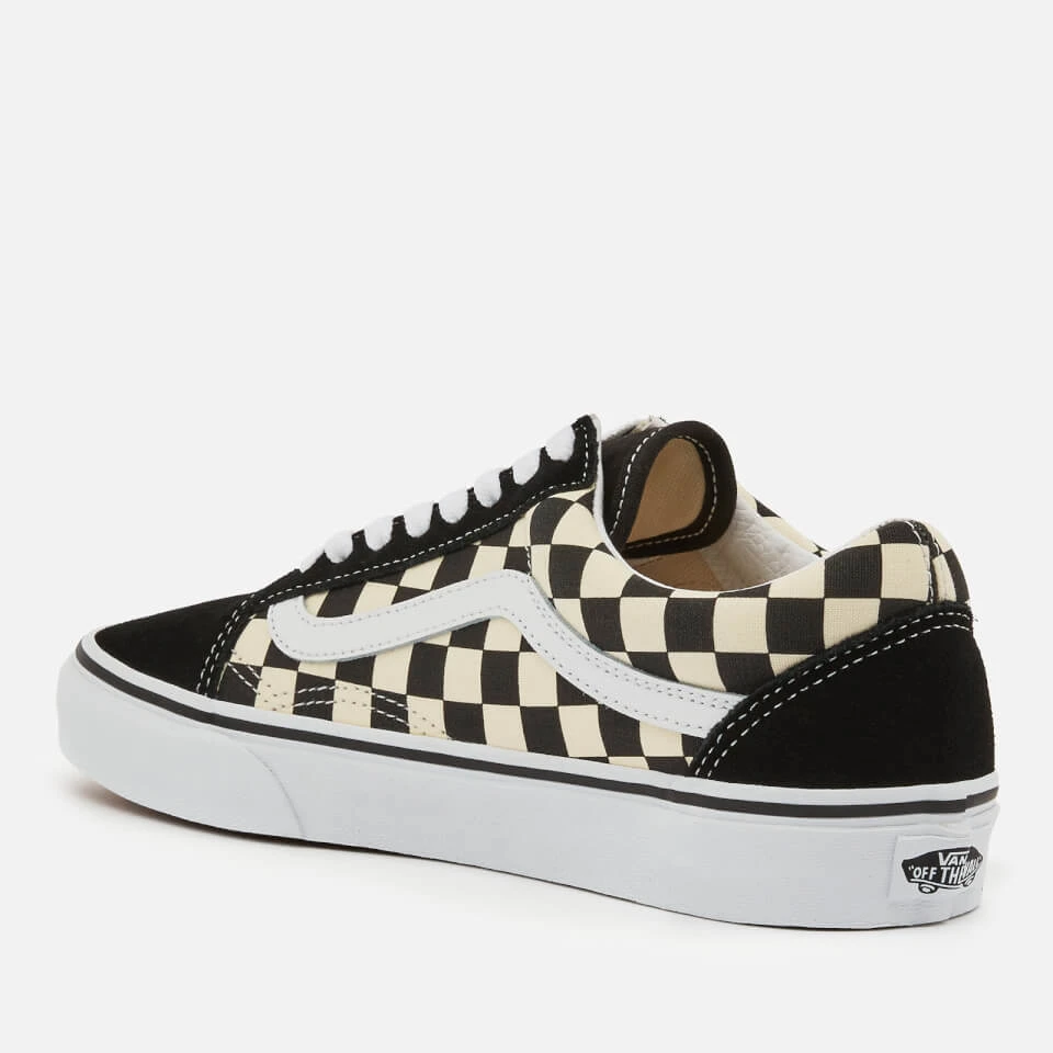Vans’ ‘Old Skool’ sneakers are a re-issue of the brand’s original 1977 design. They have comfortable suede and checkerboard canvas uppers with padded collars and iconic ‘Off the Wall’ tab across the heels. They rest on iconic waffled rubber soles for excellent traction.