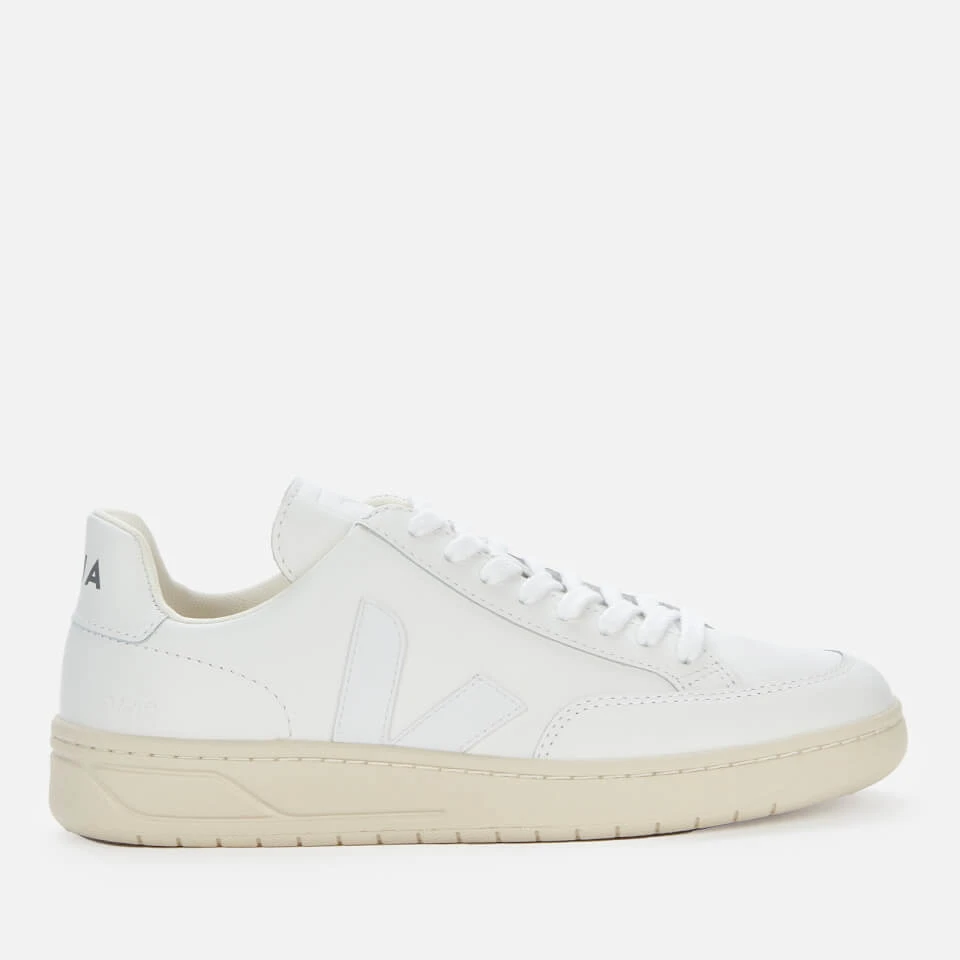 White Veja V-12 trainers with an ecological and sustainable design. Designed with smooth leather uppers, the low top trainers have signature rubber ‘V‘ logos on the sides and a heel overlay with a logo print.