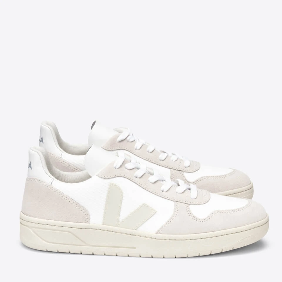 White mesh low top trainers from Veja made from ecological and sustainable materials. The ‘V10’ sneakers have white mesh uppers made from recycled plastic bottles and contrasting suede panels. The lace-up trainers have signature ‘V’ logos on the sides in rubber and a logo print on the heel overlay.