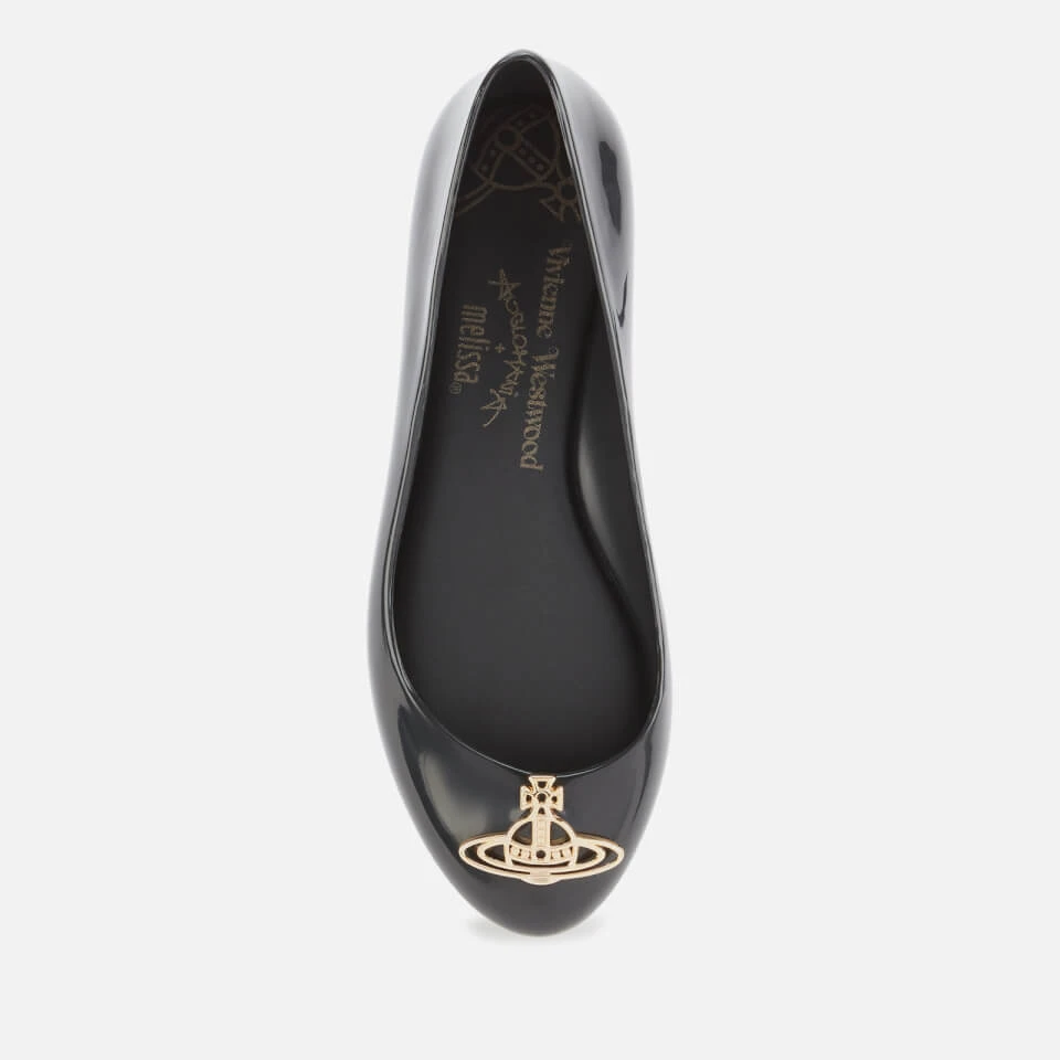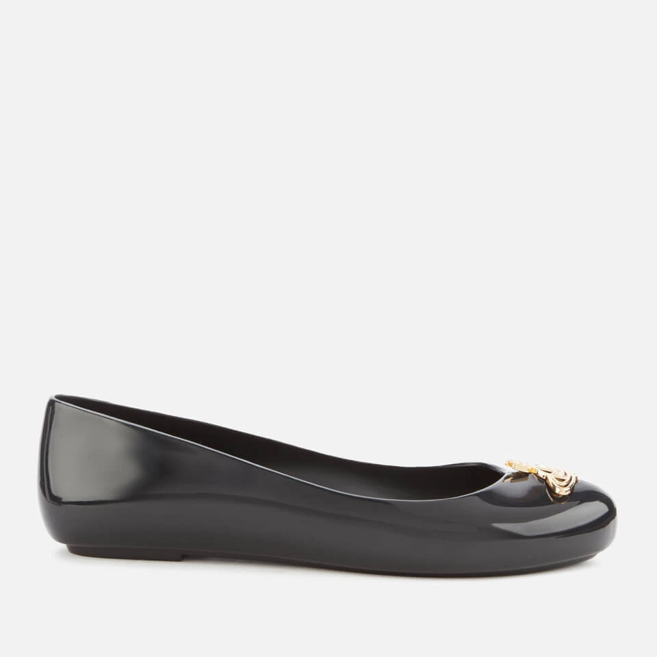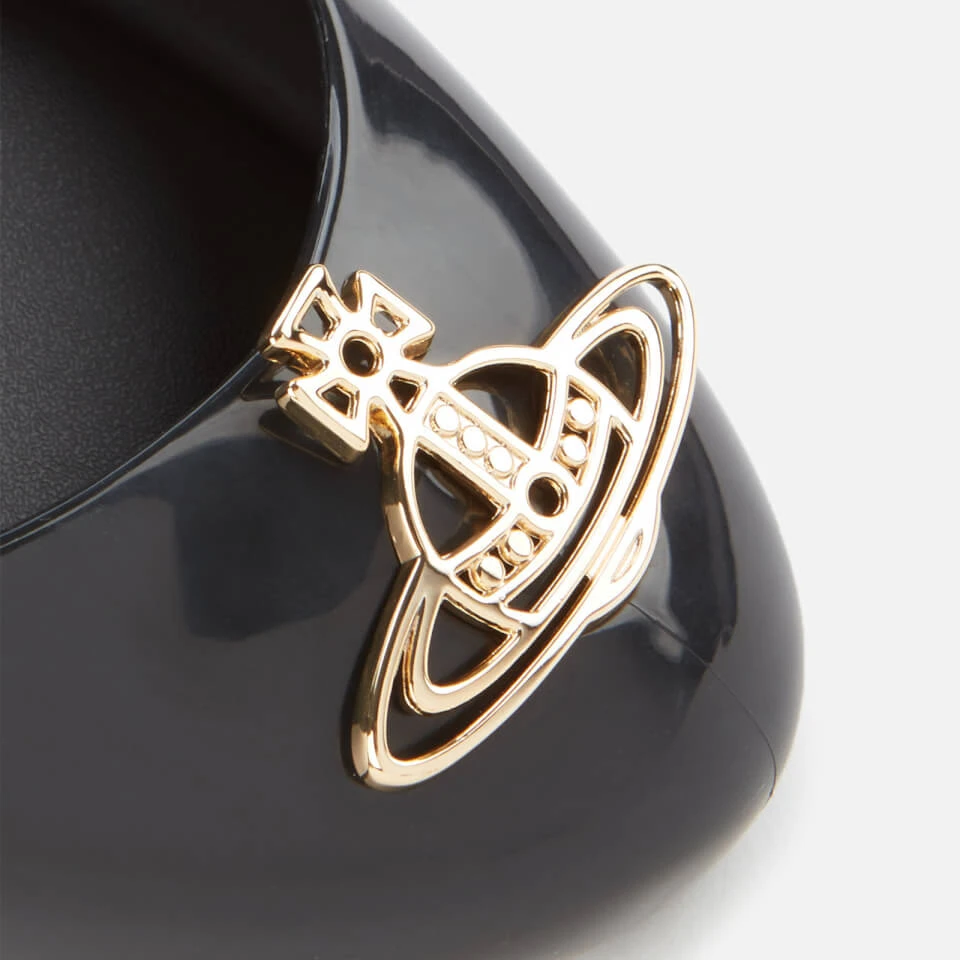 ‘Space Love’ ballet flats from Vivienne Westwood. Crafted from durable PVC, this simplistic design is decorated with a signature Westwood Orb, realised in gold-tone metal. Set upon a cushioned footbed, finished with branding and detailed with a gripped sole.