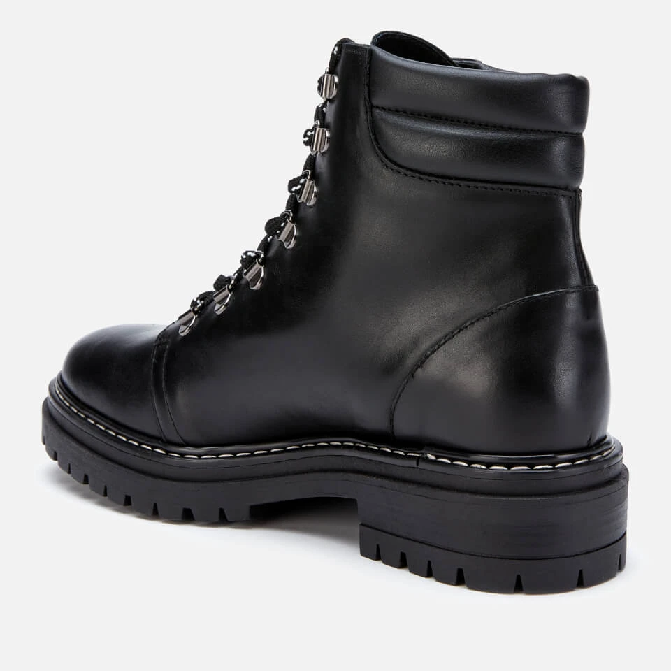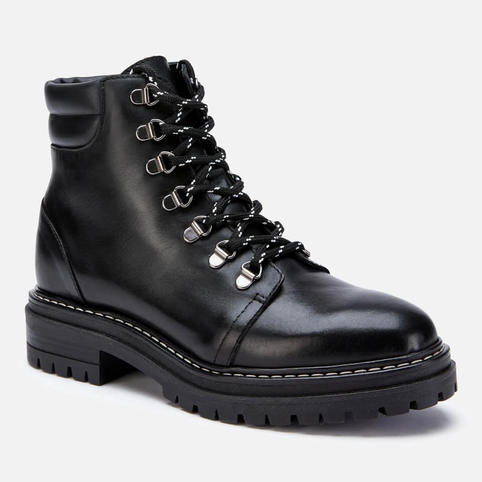 Whistles black leather combat boots with contrasting white topstitching. The military-inspired ‘Amber’ boots are crafted with supple leather uppers and sit on a chunky rubber sole with a lug outsole. The round toe boots are detailed with hiking-style silver-tone metal D-ring eyelets, contrasting coloured laces and comfortable padded collars.